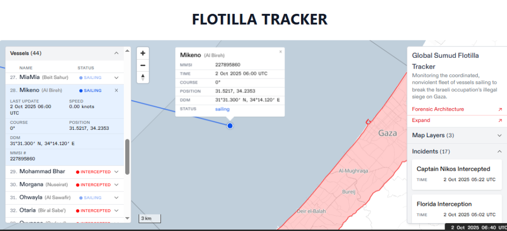 Salah satu kapal ‘Mikeno’ berhasil memasuki wilayah perairan Gaza. Namun, media CNN Turki memberikan informasi bahwa ada kemungkinan kapal tersebut sudah dikuasai penjajah karena selama setengah jam, kecepatan kapal terus bertahan di 0 knot.