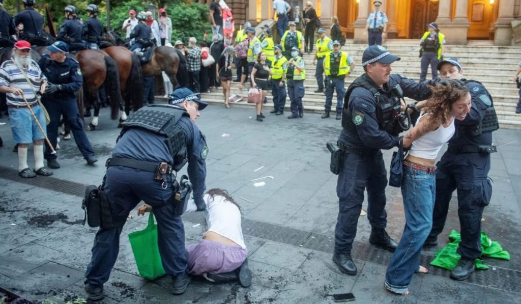 Demonstrasi di Sydney berubah tegang ketika polisi menggunakan pepper spray untuk mengendalikan massa dan membubarkan kerumunan yang mencoba melakukan aksi pawai menuju parlemen negara bagian, yang secara hukum dilarang di area tertentu saat kunjungan berlangsung. Setidaknya 27 orang ditangkap dalam bentrokan tersebut, dengan polisi menyatakan beberapa demonstran diduga menyerang petugas.